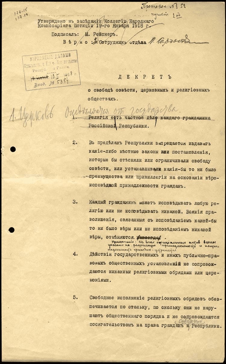[Rusya Sovyet Federatif Sosyalist Cumhuriyeti Halk Komiserleri Konseyi’nde bu kararnamenin çıkarılması konusu ilk olarak 24 (11) Aralık 1917’de gündeme getirilmiş ve kararname taslağını hazırlamak üzere Pēteris Stučka, Anatoliy Lunaçarskiy, Pyotr Krasikov, Mihail Reisner ile Mihail Galkin’in yer aldıkları özel bir komisyon oluşturulmuştur. Komisyon tarafından hazırlanan taslak metinde bilahare Lenin tarafından bir dizi değişiklik ve ekleme yapılmıştır. Komisyon tarafından hazırlanan metnin 1 inci maddesi “Din, her Rusya Cumhuriyeti yurttaşının şahsî meselesidir.” şeklindeyken, Lenin tarafından aşağıdaki haliyle değiştirilmiş, 3’üncü maddedeki not ve 13’üncü maddenin ikinci paragrafı da Lenin tarafından ilave edilmiştir. Kararname Halk Komiserleri Konseyi tarafından 20 Ocak (eski Rus takvimine göre 2 Şubat) 1918 tarihinde kabul edilmiş ve üç gün sonra yayınlanarak yürürlüğe girmiştir].