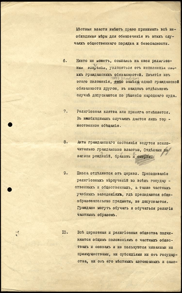 13. Rusya’da mevcut kiliselere ve dinî topluluklara ait tüm mallar kamu malı ilan edilmiştir.